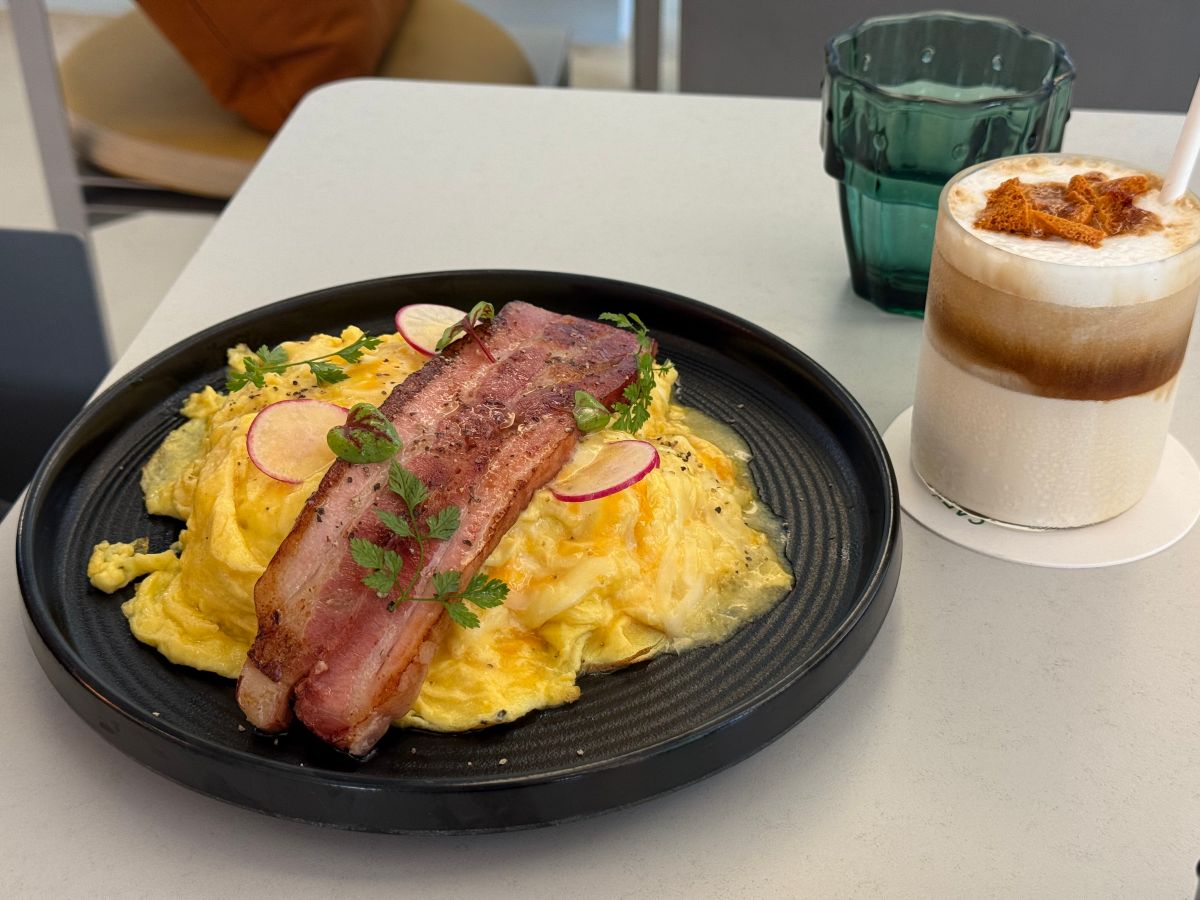 喜歡吃蛋的會愛,這道歐姆蛋的份量感覺有6顆蛋。滿滿一層,下面是麵包。很滑順沒有炒得過乾。很驚訝的是上面有一片厚培根,還以為是牛排厚度很有誠意。培根的煙燻味很香,不會柴,讓這道料理更加豐富。