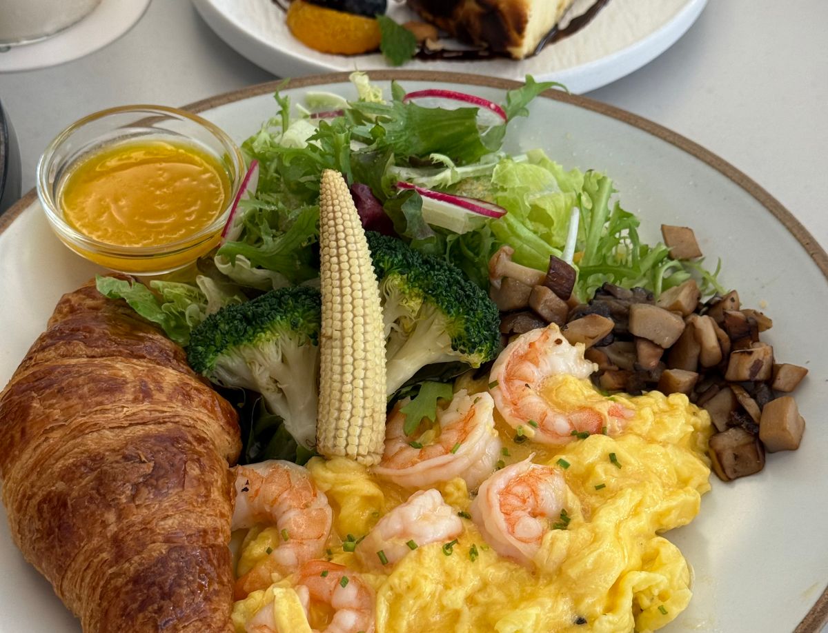 如果想來點菜,我推薦點這道。有菜有蛋,飲食比較均衡。滑蛋一樣嫩,上面還有6隻撥好的蝦子,很新鮮彈牙。生菜也佔了一大半,還有花椰菜、玉米筍和煎菇。澱粉是酥脆的可頌,增加整體飽足感。整份吃下來很滿足。