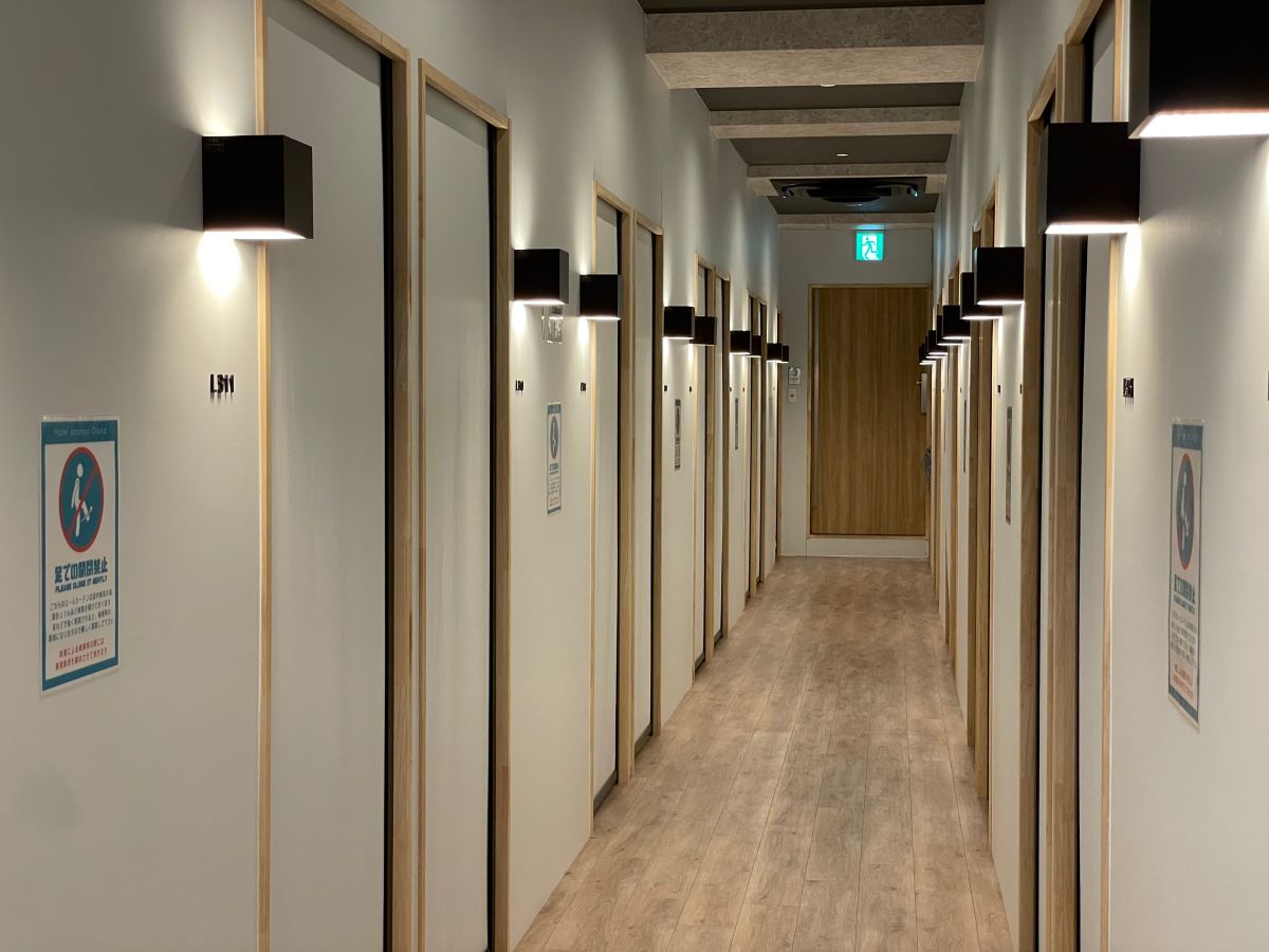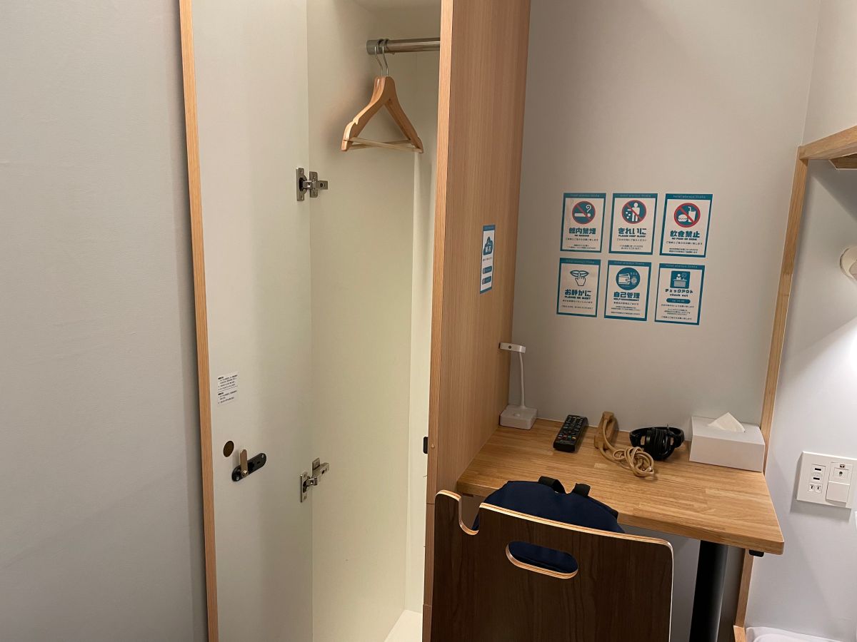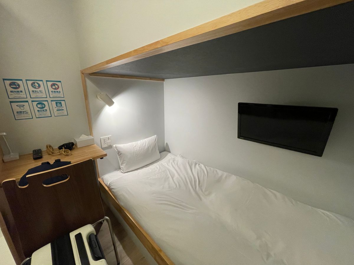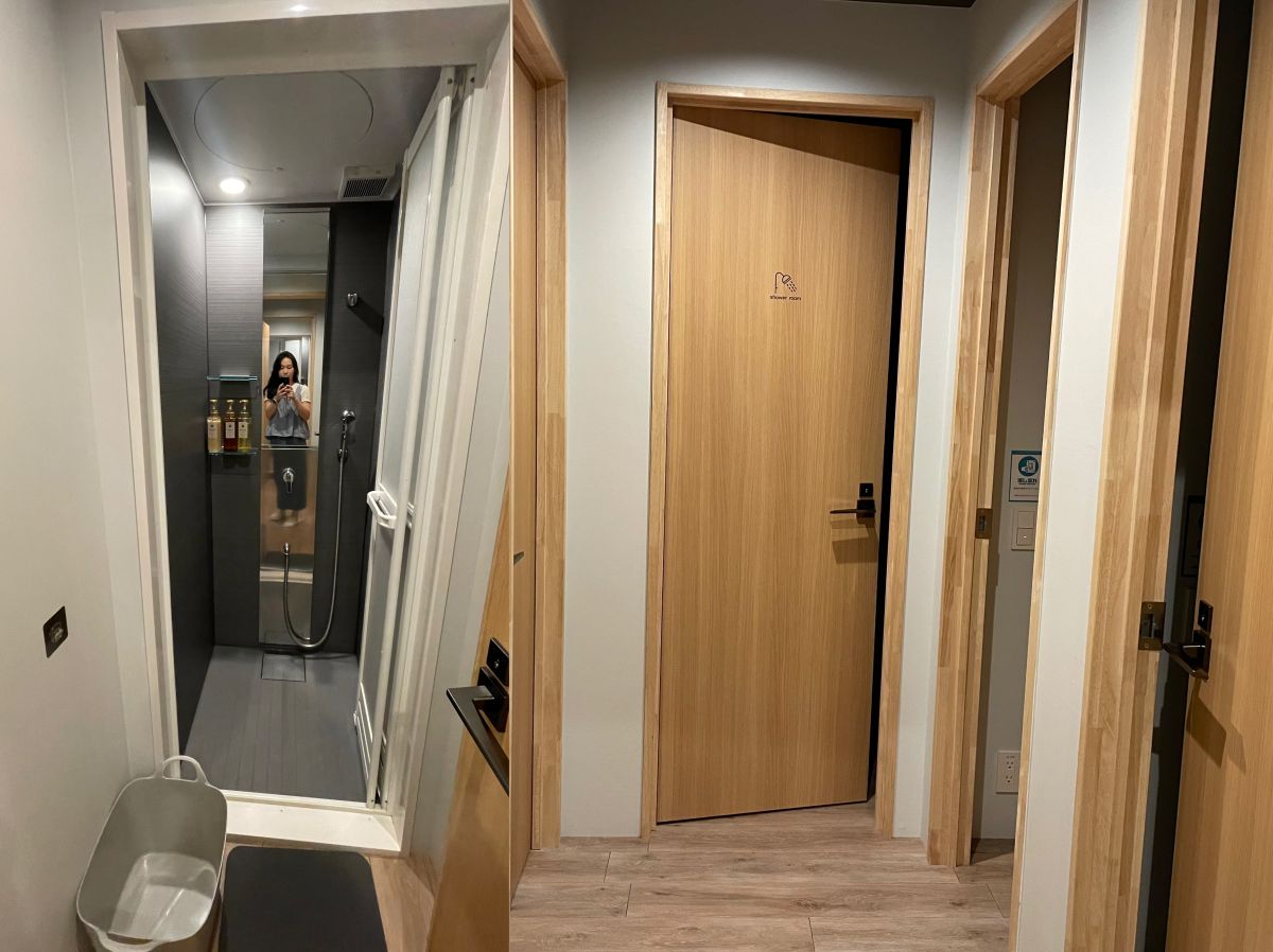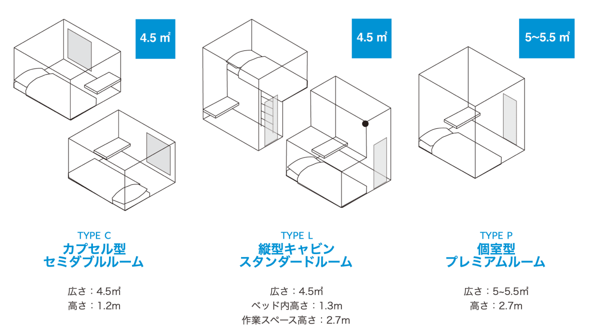 房型是有分男生專用和女生專用的樓層,無提供混宿樓層。提供的房型有3種,TYPE C、L、P。C房型是膠囊旅館比較常見的房型,空間高度不高,適合單純睡覺;L房型除了床鋪,還有提供衣櫃和辦公的空間,有比較大的空間;P房型是最大的,就像是雅房,比較不會有壓迫感。只可惜這個房型僅限男生入住。所有房型都沒有提供衛浴,需要與其餘房客共用。