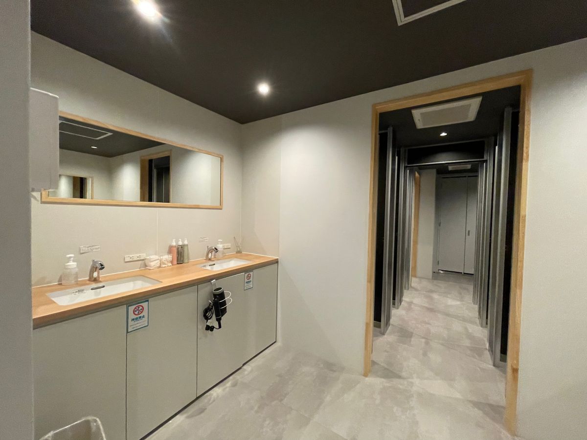 衛浴廁所和淋浴間是分開的,廁所和洗手台相鄰,間數很多環境很乾淨。另外,提供的洗手台數量也很多,總共有8個。洗手台上還有提供化妝水、乳液、洗面+卸妝乳、棉花棒和化妝棉。