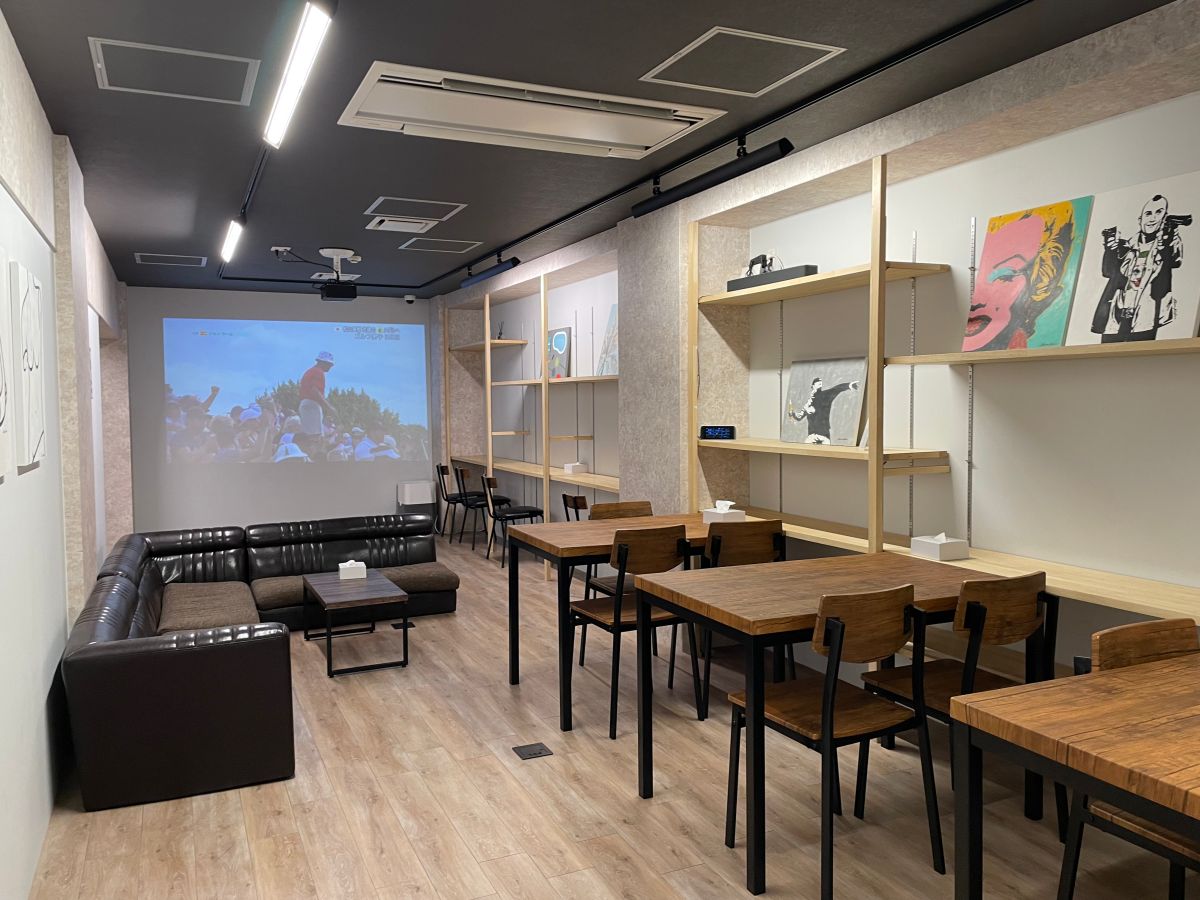 交誼廳有餐桌和沙發,大投影幕播放日本綜藝節目,我蠻常在這吃東西配電視。