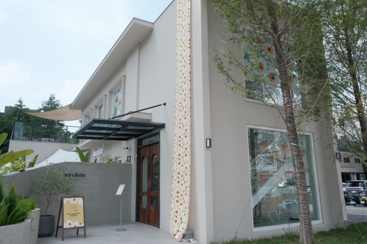 Sundate cafe是獨棟建築咖啡廳,全白建築有花花點綴,來到這的朋友都忍不住大拍特拍。太美太好看了~我們因為是很臨時的去,所以訂不到位置。選擇在一開門的時間去排隊。快10點到那,現場就有很多人。很幸運戶外座位還有,所以我們不用等太久就有座位。