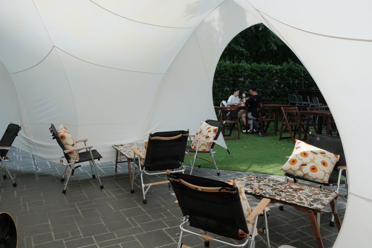 不得不說戶外座位更是漂亮,有一區白色帳篷的座位很有露營的感覺。帳篷可以遮陽,也會有電風扇吹。炎熱的夏天下,也能坐得住。