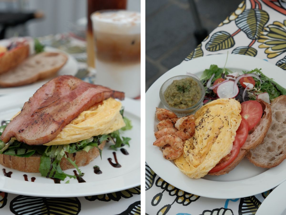 這道只有一片吐司,原本以為就像法式餐點一樣少少的。但這個份量認真多,需要拿刀叉慢慢吃。酸種吐司上鋪上滿滿的貝比生菜和炒蛋,生菜多到像在吃沙拉,很誇張。炒蛋很嫩,可以中和較乾的生菜。主食厚培根整整有一公分厚,簡單香煎不會過於油膩也不會太乾。很好吃,份量也吃得很過癮。