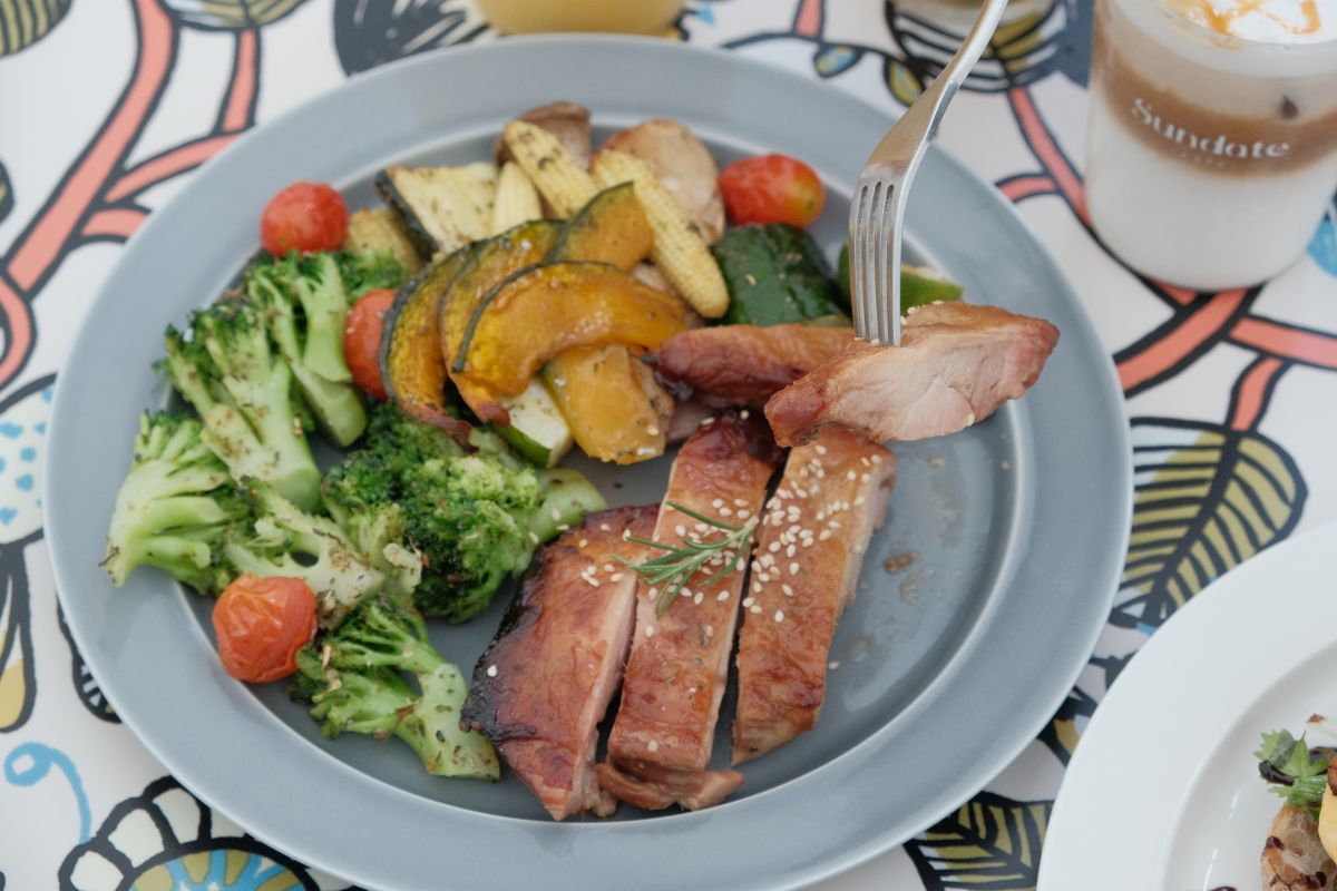 這道真的是減肥最佳餐點,完全沒有澱粉,都是原型食物。烤雞腿排,有厚度很嫩,醬料是Sundate cafe獨家秘制,辛香料味不會過重,鹹度適中。配菜有南瓜、櫛瓜、杏鮑菇、玉米筍、花椰菜和小番茄,蔬菜很多元。愛吃菜的朋友點這道!